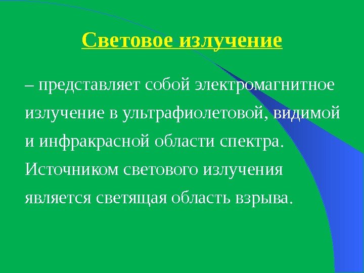 – представляет собой электромагнитное излучение в ультрафиолетовой, видимой и инфракрасной области спектра. Источником светового излучения является светящая область взрыва. Световое излучение