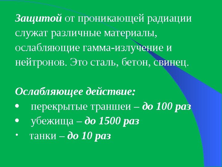 З ащитой от проникающей радиации служат различные материалы, ослабляющие гамма-излучение и нейтронов. Это сталь, бетон, свинец. Ослабляющее действие: перекрытые траншеи – до 100 раз убежища – до 1500 раз • танки – до 10 раз