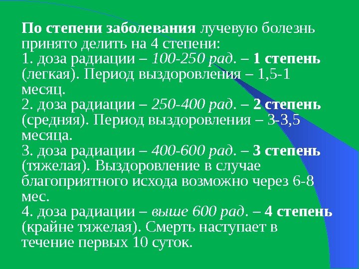 По степени заболевания лучевую болезнь принято делить на 4 степени: 1. доза радиации – 100 -250 рад. – 1 степень (легкая). Период выздоровления – 1, 5 -1 месяц. 2. доза радиации – 250 -400 рад. – 2 степень (средняя). Период выздоровления – 3 -3, 5 месяца. 3. доза радиации – 400 -600 рад. – 3 степень (тяжелая). Выздоровление в случае благоприятного исхода возможно через 6 -8 мес. 4. доза радиации – выше 600 рад. – 4 степень (крайне тяжелая). Смерть наступает в течение первых 10 суток.