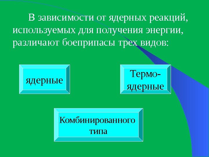 В зависимости от ядерных реакций, используемых для получения энергии, различают боеприпасы трех видов: ядерные Термо- ядерные Комбинированного типа