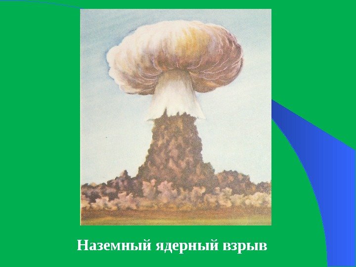 В зависимости от задач, решаемых применением Я. О. , вида и места нахождения ядерных ударов, а также характера предстоящих действий войск, ядерный взрыв может быть: Наземный Надводный Воздушный Высотный Подземный Подводный