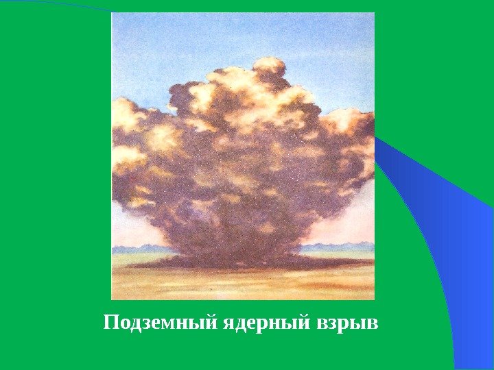 называется взрыв, произведенный на некоторой глубине в земле. При взрыве создается огромное давление на грунт, образуется ударная волна, вызывает колебания грунта, напоминающее землетрясение. Подземным ядерным взрывом