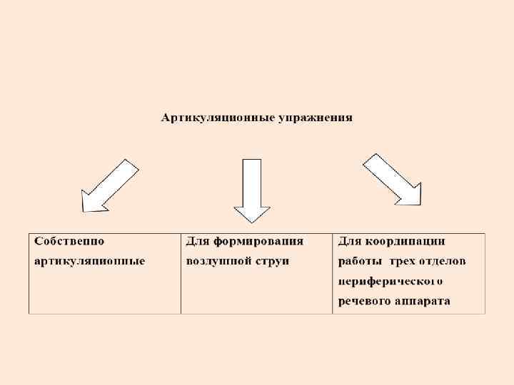 Классификация упражнений По целям проведения По характеру выполнения По участию различных отделов периферического речевого аппарата Общеразвивающие Статические Собственно артикуляционные Специфические Динамические Для формирования воздушной струи По координации работы трех отделов периферического речевого аппарата
