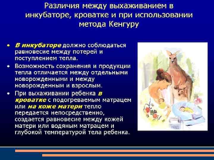 Преимущества метода Кенгуру • МК ускоряет рост и развитие недоношенного ребенка • Обеспечивает взаимодействие медицинского персонала на новом, более высоком уровне • Привлекает семью к уходу за ребенком сразу после его рождения • Предполагает взгляд на недоношенного ребенка с очень низкой и экстремально низкой массой тела как на личность, которая развивается психически, физически, психологически и социально в лечебнопрофилактическом учреждении и в кругу семьи • Амбулаторное наблюдение за детьми, выхоженными по методу «Кенгуру»