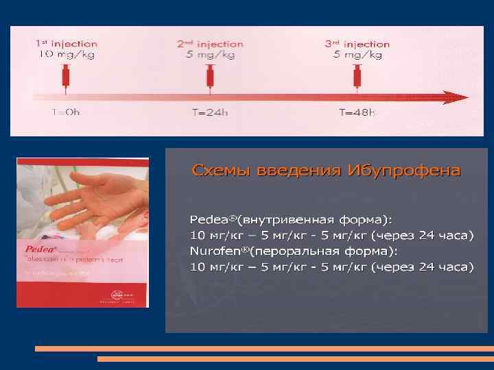 Схемы доз Ибупрофена (в/в, каждые 24 ч) 0 -70 дней жизни 10 — 5 мг/кг 70 -108 дней жизни 14 — 7 мг/кг 108 -180 дней жизни 18 — 9 мг/кг Hirt D. et al. , Br. J. Clin Pharmacol. 2008 55 629 -638