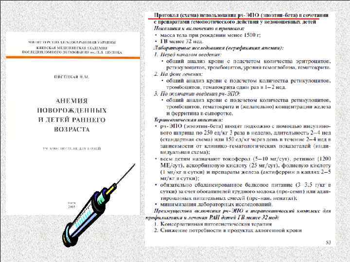 Анемия недоношенных детей Ранняя анемия недоношенных Разработан Протокол профилактики и лечения РАН с использованием альтернатив гемотрансфузионной терапии (ЭПО-терапия) Поздняя анемия недоношенных Препараты железа