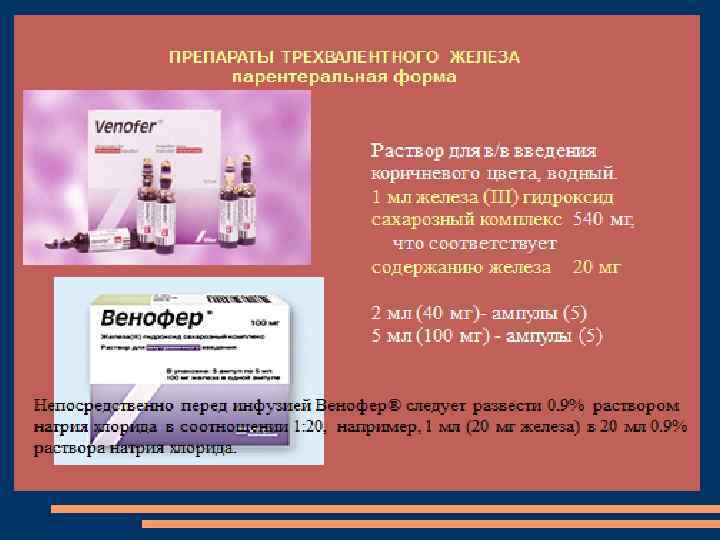 Оригинальный препарат трехвалентного железа из Швейцарии Доказанная ффективность и высокий профиль безопасности в лечении железодефицитной анемии Высокая приверженность к терапии: совместимость с компонентами пищи и другими лекарственными средствами Рекомендован с первых дней жизни