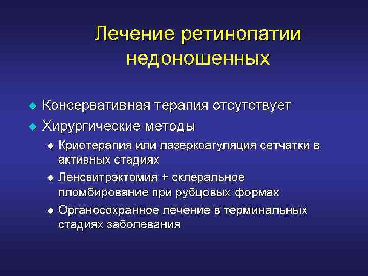 Факторы риска развития РН О 2 – терапия Масса тела при рождении < 1500 г Фототерапия Трансфузия крови СДР, ОАП Начало скрининга детей – БЛД с 4 -6 нед жизни Сепсис Офтальмоскопический контроль в динамике – регулярно с интервалом 1 -2 недели