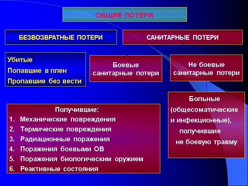 Для учета боевых санитарных потерь применяется классификация и номенклатура боевых поражений, которая включает шесть классов: 1. Механические повреждения 2. Термические повреждения 3. Радиационные поражения 4. Поражения отравляющими веществами 5. Поражения биологическим оружием 6. Реактивные состояния