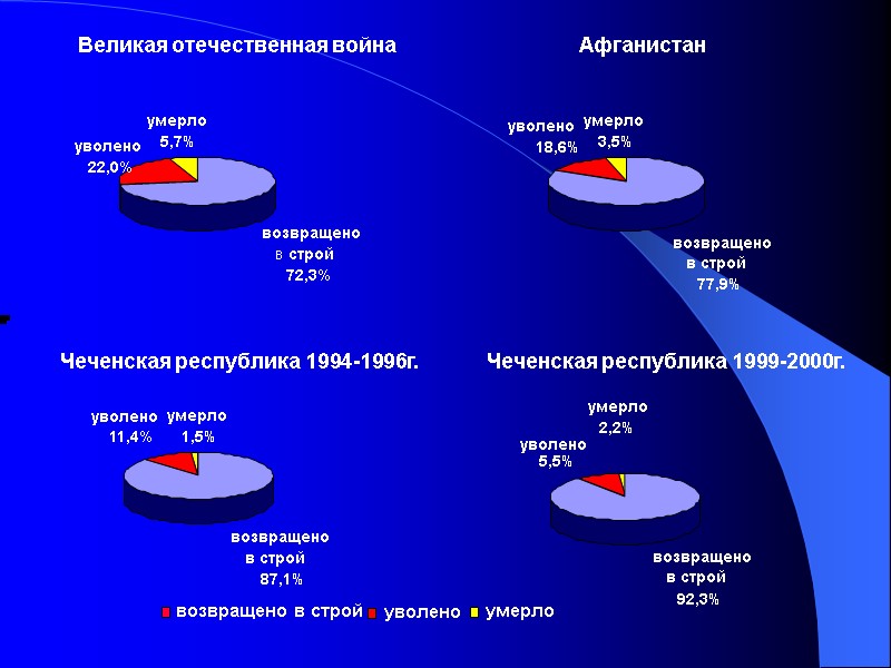 Исходы лечения характеризуются высокими показателями восстановления боеспособности (>90%) Исходы лечения раненых и больных в ходе проведения КТО на территории Северного Кавказа 1999-2000 г.г.