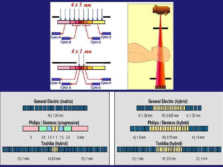 6 1 2 3 4 5 Схема электронно-лучевого томографа: 1 – электронная пушка; 2 – поток электронов; 3 – фокусирующая катушка; 4 – направляющая катушка; 5 – мишень; 6 – детекторы