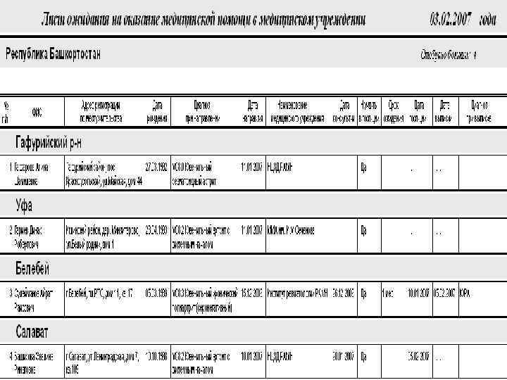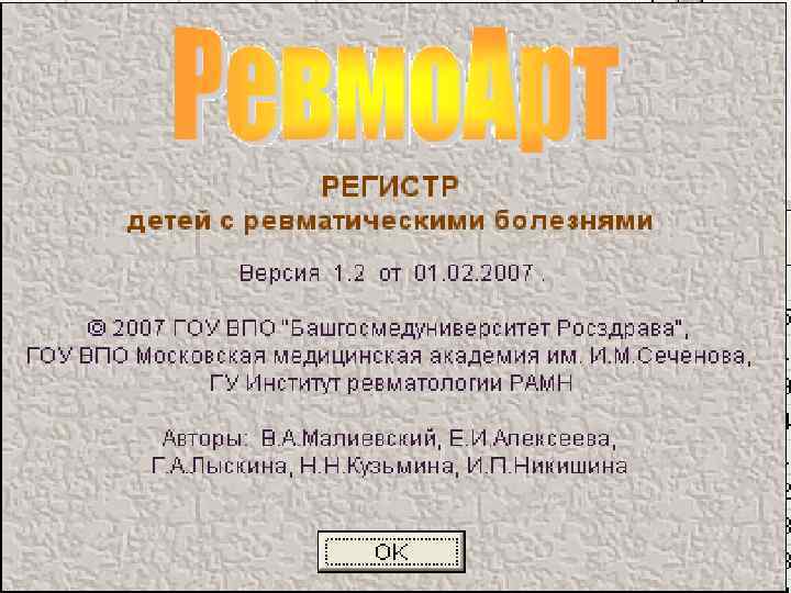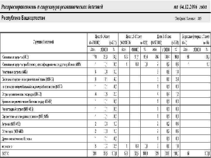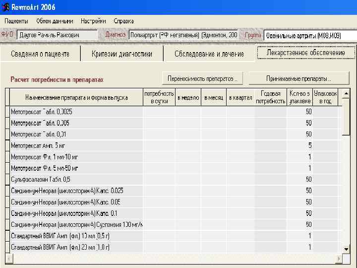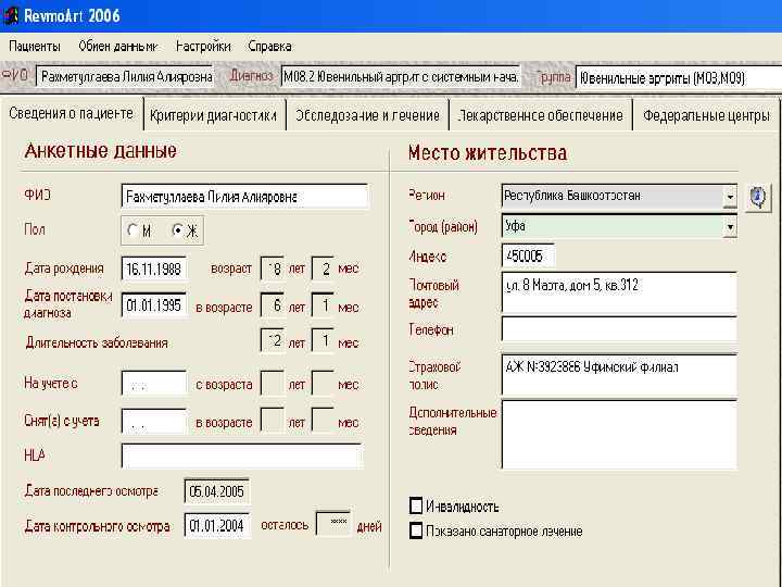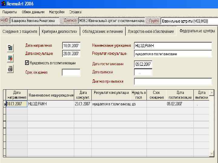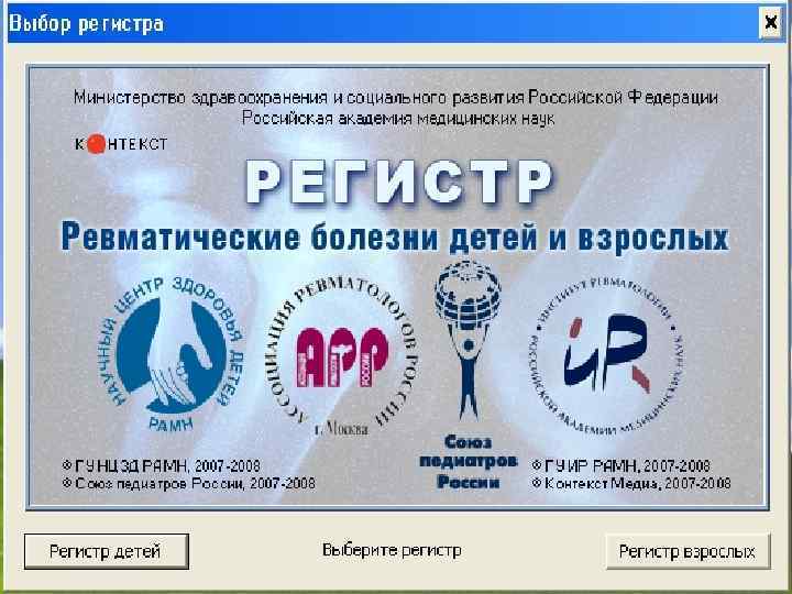 Регистр больных ревматическими болезнями: • ввод и хранение информации о больных; • расчет распространенности и структуры ревматических болезней; • анализ частоты различных исходов и осложнений ревматических болезней; • расчет годовой потребности в лекарственных препаратах; • формирование и печать сводного списка больных; • учет детей – инвалидов; • учет нуждающихся в санаторном лечении; • составление листа ожидания на лечение в федеральных центрах.
