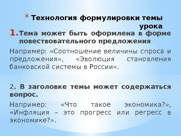 * Технология формулировки темы урока 1. Тема может быть оформлена в форме повествовательного предложения Например: «Соотношение величины спроса и предложения» , «Эволюция становления банковской системы в России» . 2. В заголовке темы может содержаться вопрос. Например: «Что такое экономика? » , «Инфляция – это прогресс или регресс в экономике? » .