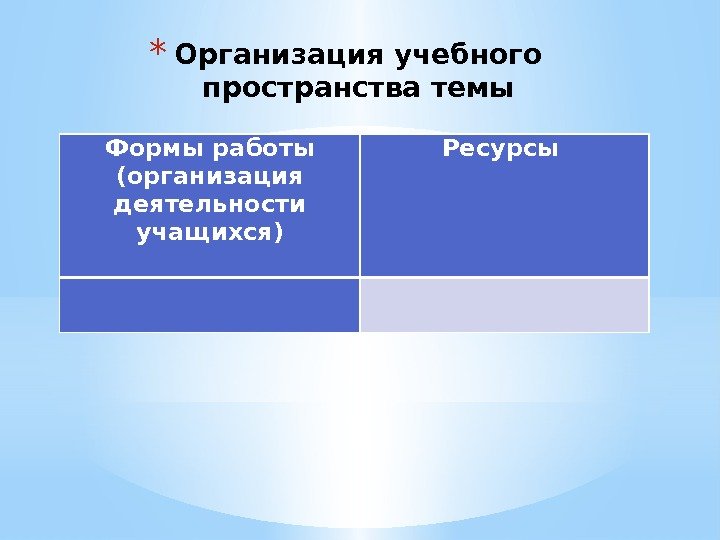 * Организация учебного пространства темы Формы работы (организация деятельности учащихся) Ресурсы