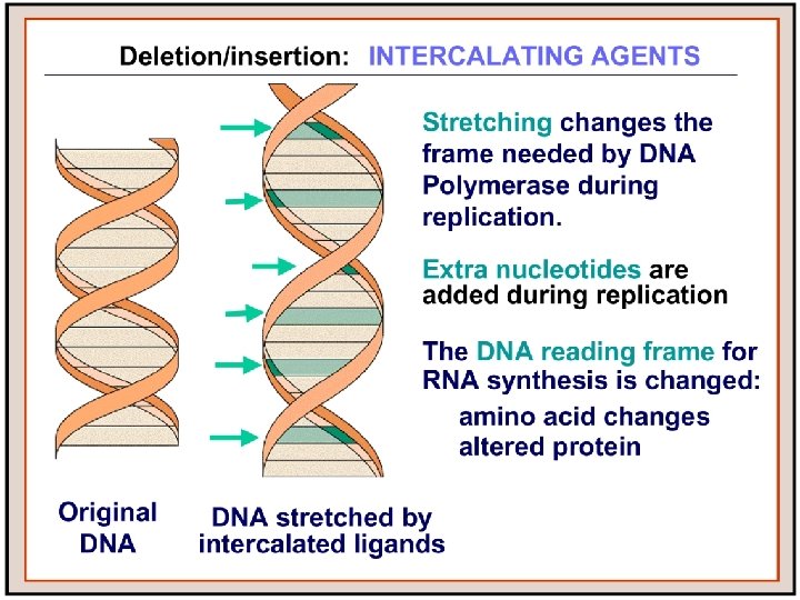Интеркалирующие соединения • Красители нуклеиновых кислот, обладающие способностью интеркалировать между основаниями ДНК, вызывают мутации со сдвигом рамки считывания. • Примерами таким красителей являются широко используемые в лабораторной практике бромистый этидий и производные акридина.