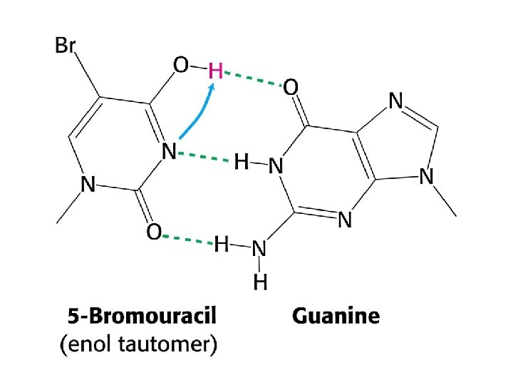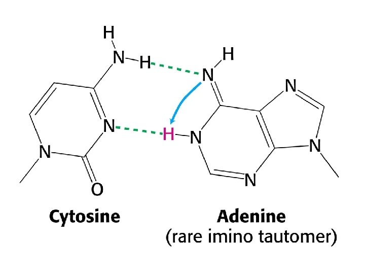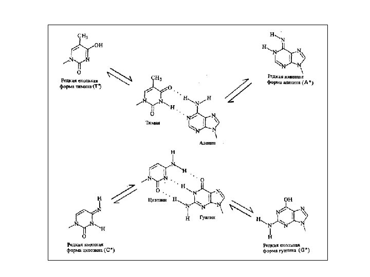Таутомерные переходы Ø Таутомерия (от греч. tautós — тот же самый и méros — доля, часть), быстрая обратимая структурная изомеризация; способные к таутомерии вещества при установившемся равновесии представляют собой смеси двух (или нескольких) взаимопревращающихся изомеров — таутомеров. Ø Цитозин и аденин имеют при ароматическом гетероцикле аминную группу, а тимин и гуанин кетонную, следовательно есть возможность аминно-иминной кето -енольной таутомерии. Ø Образующиеся в момент репликации редкие иминные и енольные формы оснований влекут за собой их ошибочное спаривание, а следовательно понижают точность работы ДНК-полимераз.