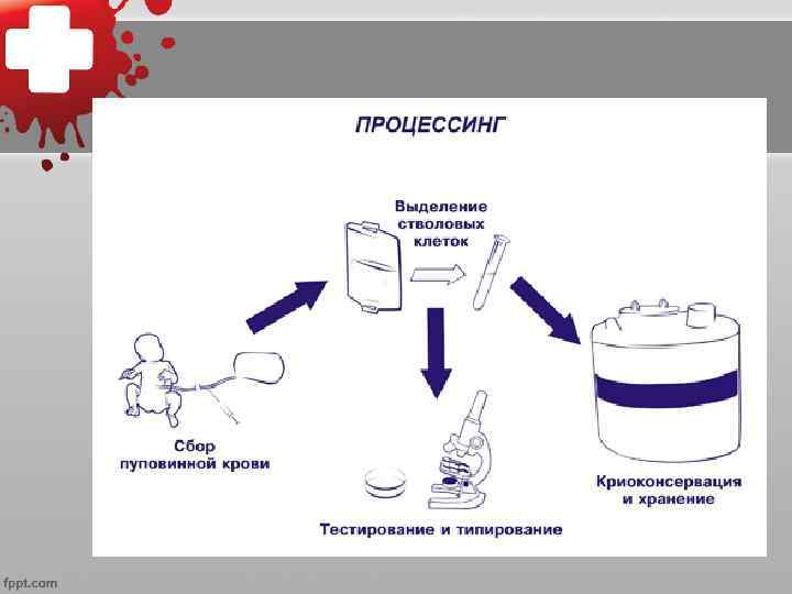 Технология обработки пуповинной крови 1. Забор пуповинной/плацентарной крови. Кровь из пуповины и плаценты самотеком поступает в контейнер с антикоагулянтом – специальным веществом, препятствующим свертыванию крови. 2. Тестирование крови на стерильность и типирование. Типирование – анализ клеточного состава пуповинной крови 3. Выделение стволовых клеток - вводят специальные реагенты для осаждения эритроцитов. - фракцию, содержащую гемопоэтические стволовые клетки, при помощи плазмоэкстрактора отделяют от эритроцитарного осадка. -пакет с клеточной массой центрифугируют для отделения излишков плазмы -к клеточной массе добавляют криопротекторы, которые защищают клетки от гибели при замораживании. 4. Расфасовка стволовых клеток