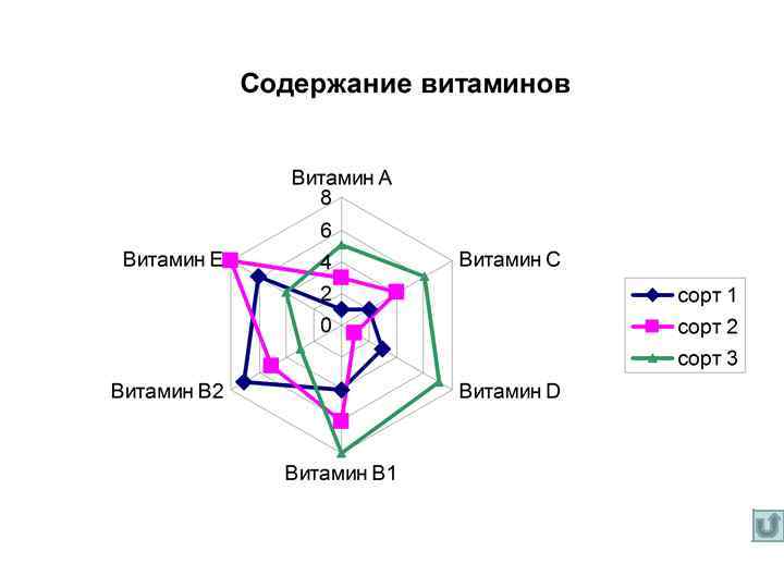 Лепестковая диаграмма • В лепестковой диаграмме каждая категория имеет собственную ось координат, исходящую из начала координат. Линиями соединяются все значения из определенной серии. • Лепестковая диаграмма позволяет сравнить общие значения из нескольких наборов данных.