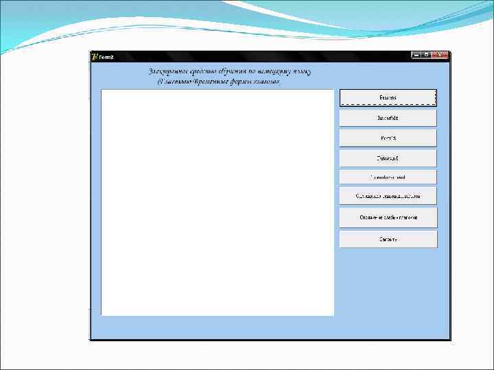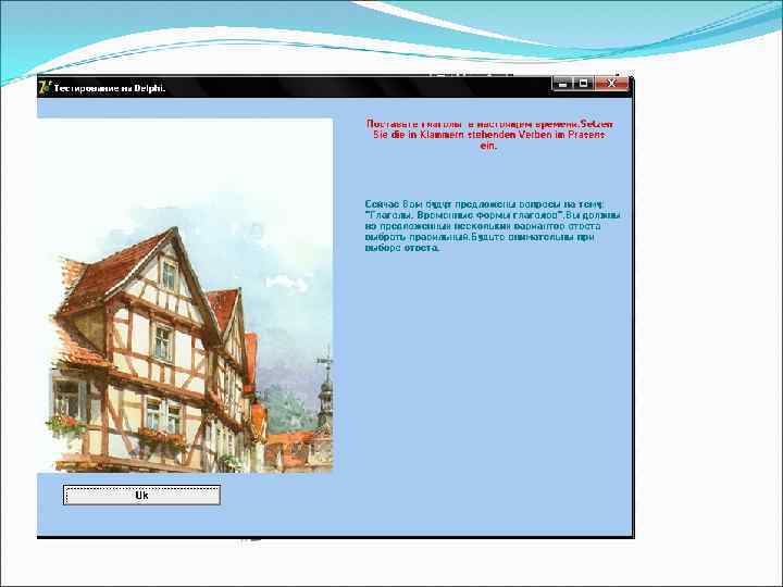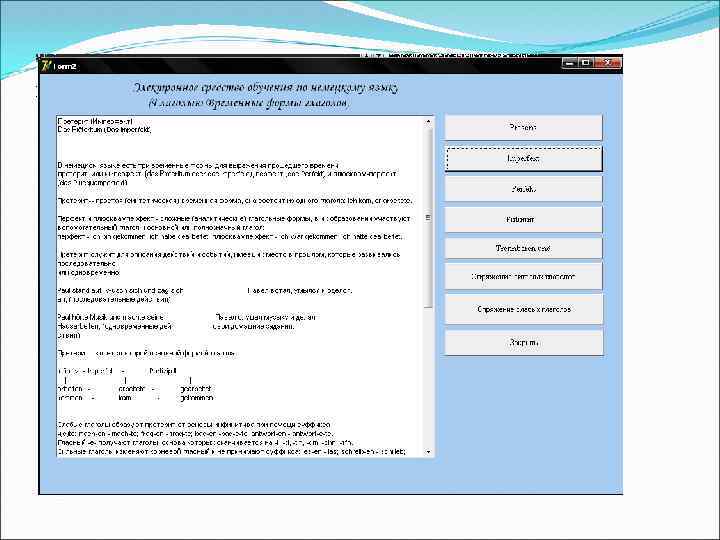 Заключение В ходе работы над дипломным проектом произведен анализ литературы по существующим электронным средствам обучения, разработано электронное средство обучения по немецкому языку «Глаголы. Временные формы глаголов» . При помощи созданной средствами Borland Delphi 7 пользователь имеет реальную возможность быстро освоить изучаемы материал и пройти контроль по изученной теме. В дальнейшем, возможно расширение функциональности средства обучения и использование его для моделирования других средств обучения.
