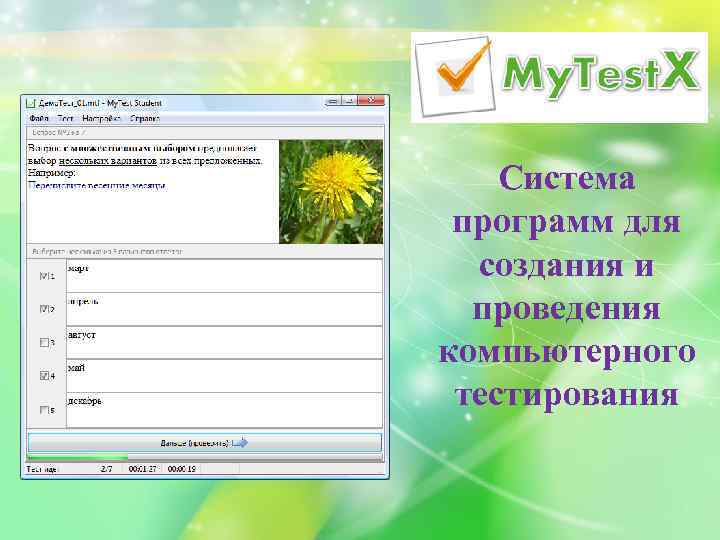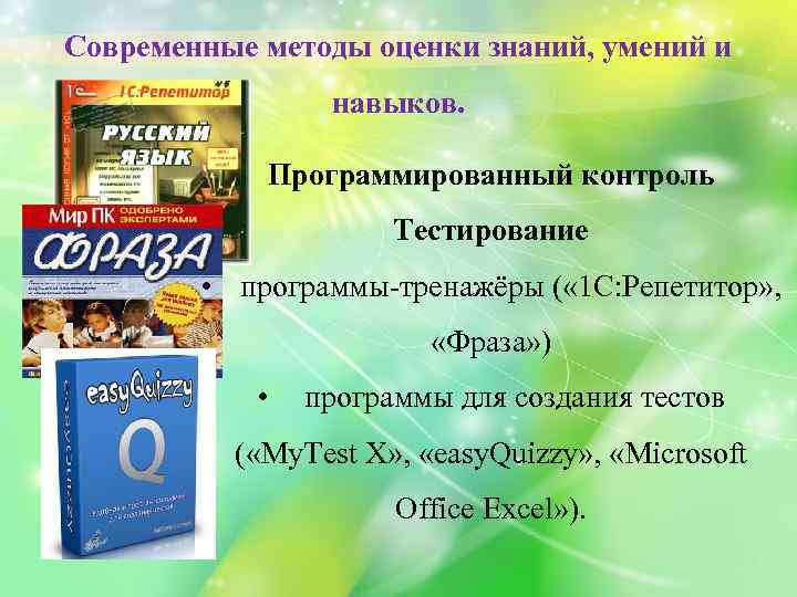 Современные методы оценки знаний, умений и навыков. Программированный контроль Тестирование • программы-тренажёры ( « 1 С: Репетитор» , «Фраза» ) • программы для создания тестов ( «My. Test X» , «easy. Quizzy» , «Microsoft Office Excel» ).