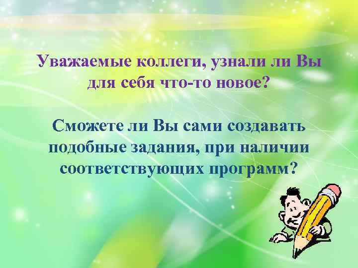 Уважаемые коллеги, узнали ли Вы для себя что-то новое? Сможете ли Вы сами создавать подобные задания, при наличии соответствующих программ?