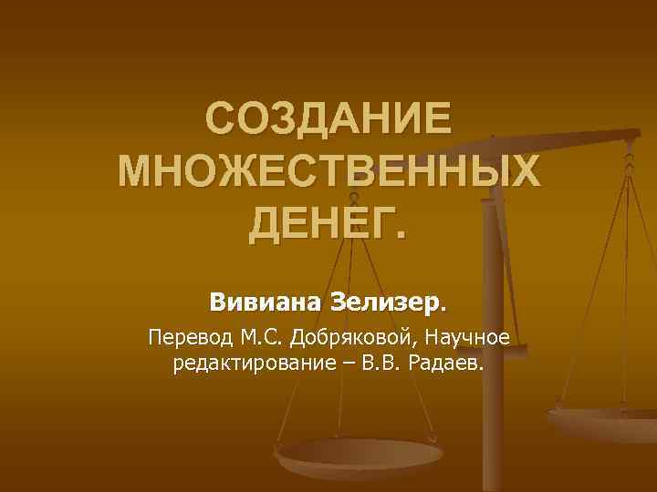 СОЗДАНИЕ МНОЖЕСТВЕННЫХ ДЕНЕГ. Вивиана Зелизер. Перевод М. С. Добряковой, Научное редактирование – В. В. Радаев.