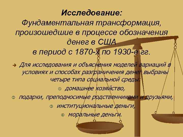 Исследование: Фундаментальная трансформация, произошедшие в процессе обозначения денег в США в период с 1870 -х по 1930 -е гг. è Для исследования и объяснения моделей вариаций в условиях и способах разграничения денег выбраны четыре типа социальной среды: домашнее хозяйство, подарки, преподносимые родственниками и друзьями, институциональные деньги, моральные деньги.