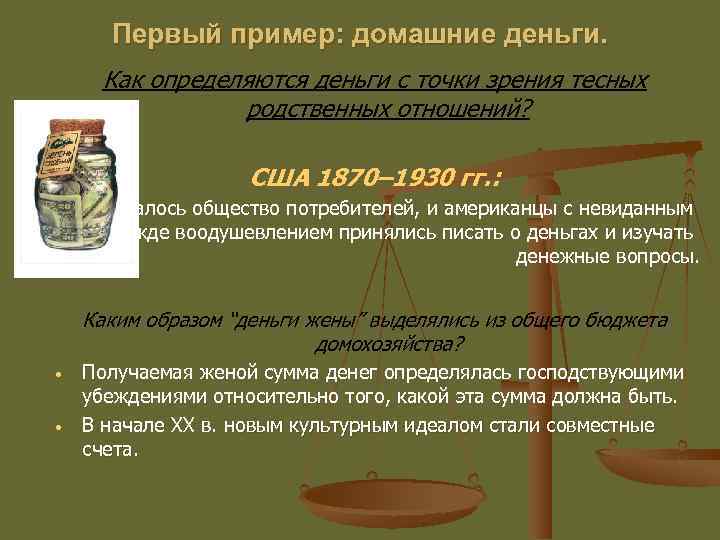 Первый пример: домашние деньги. Как определяются деньги с точки зрения тесных родственных отношений? США 1870– 1930 гг. : складывалось общество потребителей, и американцы с невиданным прежде воодушевлением принялись писать о деньгах и изучать денежные вопросы. Каким образом “деньги жены” выделялись из общего бюджета домохозяйства? • • Получаемая женой сумма денег определялась господствующими убеждениями относительно того, какой эта сумма должна быть. В начале ХХ в. новым культурным идеалом стали совместные счета.