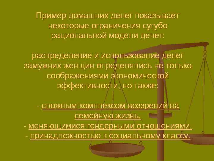 Пример домашних денег показывает некоторые ограничения сугубо рациональной модели денег: распределение и использование денег замужних женщин определялись не только соображениями экономической эффективности, но также: - сложным комплексом воззрений на семейную жизнь, - меняющимися гендерными отношениями, - принадлежностью к социальному классу.