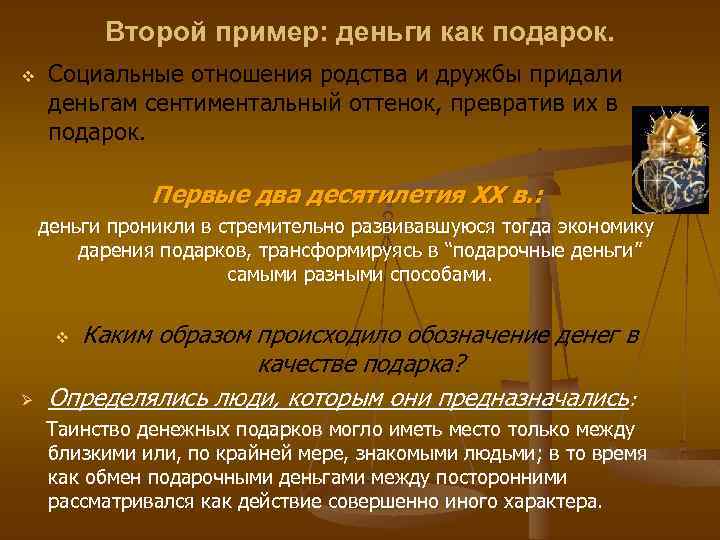 Второй пример: деньги как подарок. v Социальные отношения родства и дружбы придали деньгам сентиментальный оттенок, превратив их в подарок. Первые два десятилетия ХХ в. : деньги проникли в стремительно развивавшуюся тогда экономику дарения подарков, трансформируясь в “подарочные деньги” самыми разными способами. Каким образом происходило обозначение денег в качестве подарка? Определялись люди, которым они предназначались: v Ø Таинство денежных подарков могло иметь место только между близкими или, по крайней мере, знакомыми людьми; в то время как обмен подарочными деньгами между посторонними рассматривался как действие совершенно иного характера.