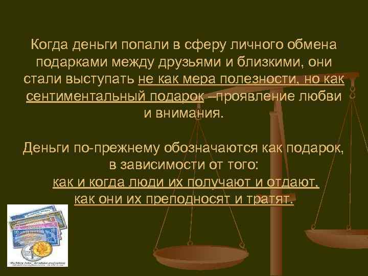 Когда деньги попали в сферу личного обмена подарками между друзьями и близкими, они стали выступать не как мера полезности, но как сентиментальный подарок –проявление любви и внимания. Деньги по-прежнему обозначаются как подарок, в зависимости от того: как и когда люди их получают и отдают, как они их преподносят и тратят.