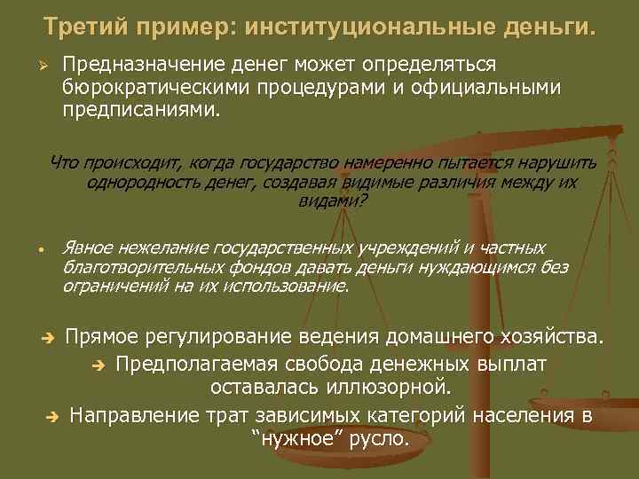 Третий пример: институциональные деньги. Ø Предназначение денег может определяться бюрократическими процедурами и официальными предписаниями. Что происходит, когда государство намеренно пытается нарушить однородность денег, создавая видимые различия между их видами? Явное нежелание государственных учреждений и частных благотворительных фондов давать деньги нуждающимся без ограничений на их использование. • Прямое регулирование ведения домашнего хозяйства. è Предполагаемая свобода денежных выплат оставалась иллюзорной. è Направление трат зависимых категорий населения в “нужное” русло. è