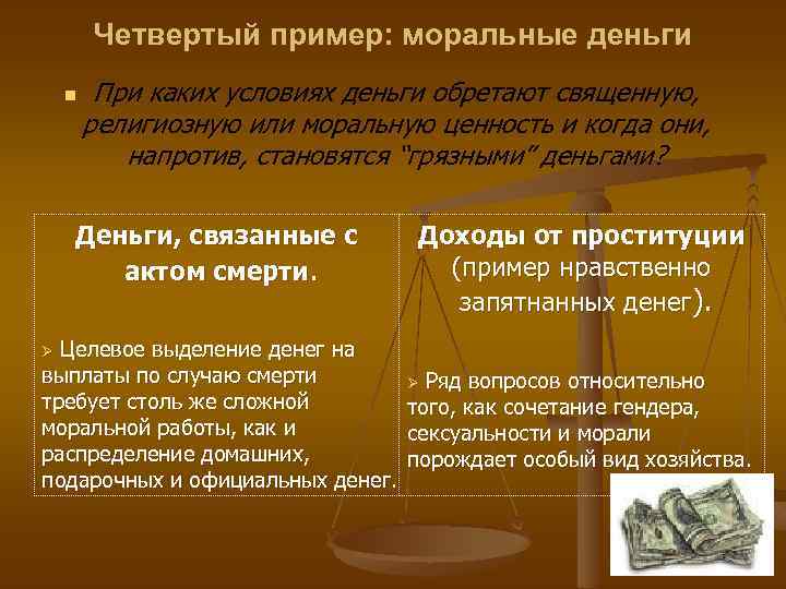 Четвертый пример: моральные деньги n При каких условиях деньги обретают священную, религиозную или моральную ценность и когда они, напротив, становятся “грязными” деньгами? Деньги, связанные с актом смерти. Доходы от проституции (пример нравственно запятнанных денег). Целевое выделение денег на выплаты по случаю смерти Ø Ряд вопросов относительно требует столь же сложной того, как сочетание гендера, моральной работы, как и сексуальности и морали распределение домашних, порождает особый вид хозяйства. подарочных и официальных денег. Ø