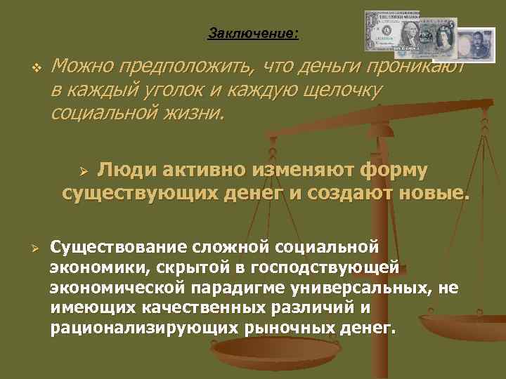 Заключение: v Можно предположить, что деньги проникают в каждый уголок и каждую щелочку социальной жизни. Люди активно изменяют форму существующих денег и создают новые. Ø Ø Существование сложной социальной экономики, скрытой в господствующей экономической парадигме универсальных, не имеющих качественных различий и рационализирующих рыночных денег.