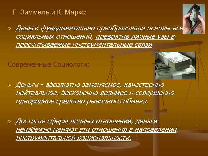 Г. Зиммель и К. Маркс: Ø Деньги фундаментально преобразовали основы всех социальных отношений, превратив личные узы в просчитываемые инструментальные связи Современные Социологи: Ø Ø Деньги - абсолютно заменяемое, качественно нейтральное, бесконечно делимое и совершенно однородное средство рыночного обмена. Достигая сферы личных отношений, деньги неизбежно меняют эти отношения в направлении инструментальной рациональности.