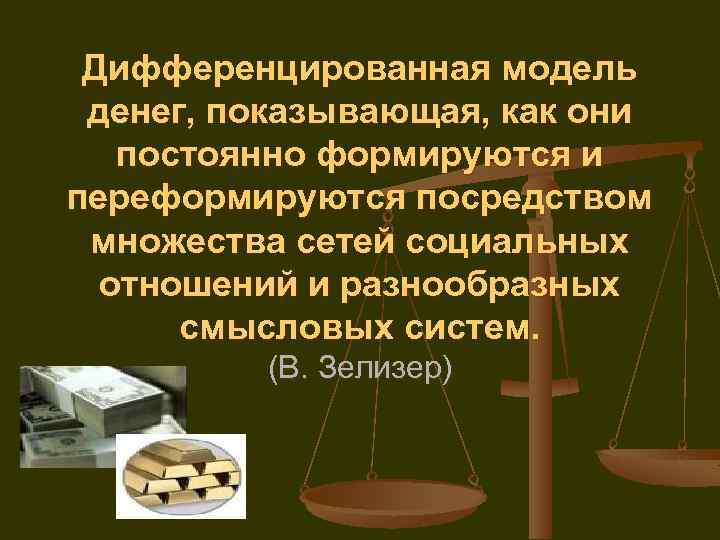 Дифференцированная модель денег, показывающая, как они постоянно формируются и переформируются посредством множества сетей социальных отношений и разнообразных смысловых систем. (В. Зелизер)