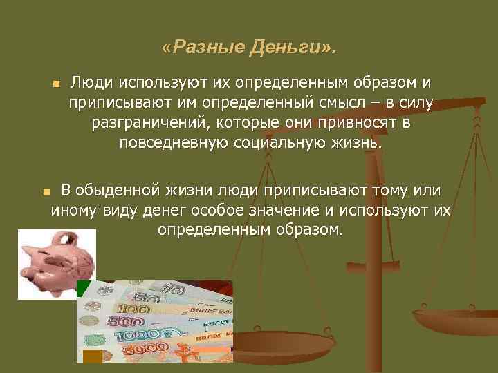 «Разные Деньги» . n Люди используют их определенным образом и приписывают им определенный смысл – в силу разграничений, которые они привносят в повседневную социальную жизнь. В обыденной жизни люди приписывают тому или иному виду денег особое значение и используют их определенным образом. n