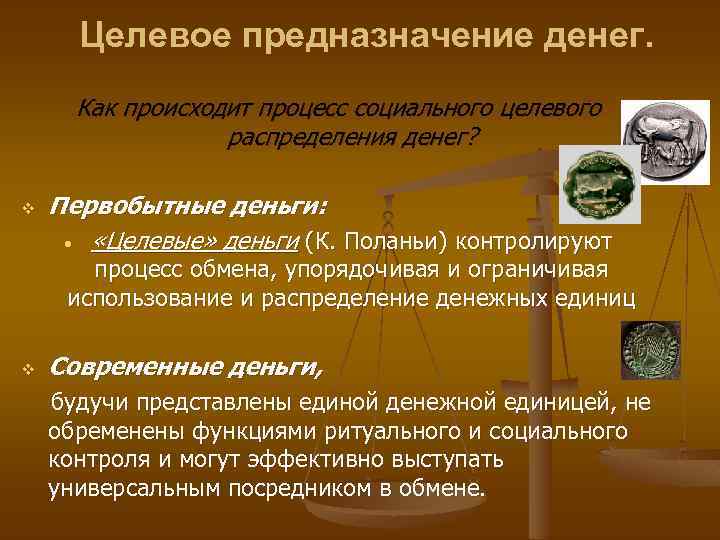 Целевое предназначение денег. Как происходит процесс социального целевого распределения денег? v Первобытные деньги: • «Целевые» деньги (К. Поланьи) контролируют процесс обмена, упорядочивая и ограничивая использование и распределение денежных единиц v Современные деньги, будучи представлены единой денежной единицей, не обременены функциями ритуального и социального контроля и могут эффективно выступать универсальным посредником в обмене.