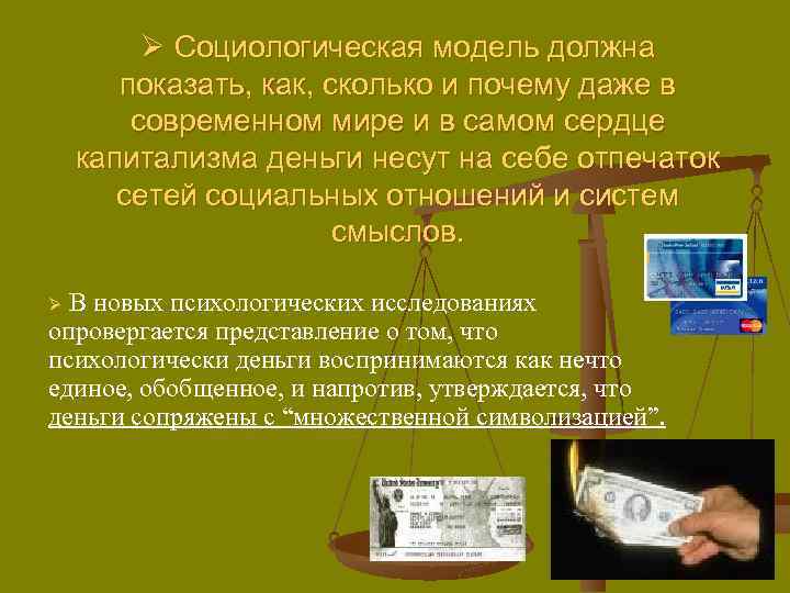 Ø Социологическая модель должна показать, как, сколько и почему даже в современном мире и в самом сердце капитализма деньги несут на себе отпечаток сетей социальных отношений и систем смыслов. В новых психологических исследованиях опровергается представление о том, что психологически деньги воспринимаются как нечто единое, обобщенное, и напротив, утверждается, что деньги сопряжены с “множественной символизацией”. Ø