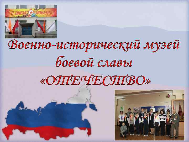 Цели и задачи военно-исторического музея боевой славы «ОТЕЧЕСТВО» Военно-исторический музеи боевой славы «ОТЕЧЕСТВО» призван способствовать: Ø формированию гражданско-патриотических качеств в сознании детей и подростков на основе изучения военной истории своей страны, сохранению и развитию чувства гордости за свою Родину; Ø расширению кругозора и воспитанию познавательных интересов и способностей, овладению учащимися практическими навыками краеведческой и поисковоисследовательской; Ø формированию личности, готовой к самостоятельному решению мировоззренческих и исследовательских задач; Ø продолжению лучших традиций школы; Ø всестороннему развитию способностей детей средствами музейной педагогики; Ø пополнению музейных фондов.