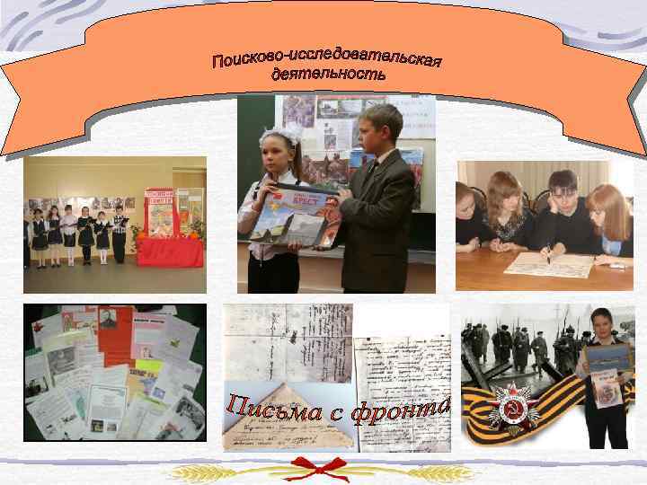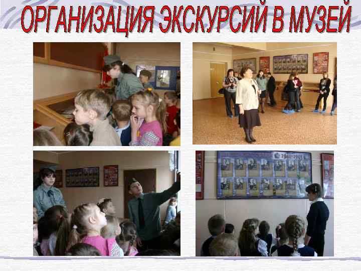 Изучение: Роль музея в учебно-воспитательном процессе ü истории Великой Отечественной войны - это основная экспозиция музея. Развитие способностей детей : ü работа с литературой, справочниками, документами, знакомство с архивными материалами, обращение за помощью в сборе материалов к родственникам, ветеранам войны, наблюдение, анализ, обмен опытом, приобретение навыков исследовательской деятельности, защита проектов. Ведение поисково-собирательной работы. Проведение: ü ü ü экскурсий по различным темам; уроков, использование отдельных экспозиций в различных классах при изучении определенных тем учебной программы по истории. ; занятий объединений дополнительного образования; совместно с поисковыми группами 5 -11 классов работы с ветеранами и семьями ветеранов Великой Отечественной войны, войны в Афганистане и Чечне с Советом музея совместно с Советом ветеранов № 8 муниципального района «Выхино-Жулебино» и учащимися школы культурно - массовой, просветительной, военно-патриотической работы; викторин, конкурсов сочинений, стихов, рисунков на военную тему, инсценированных песен Организация: ü ü экскурсионной деятельности; военно-спортивных праздников, участие в районных, окружных и городских соревнованиях; инициативной группой «Забота» шефской помощи ветеранам района ; отряда «Юных следопытов» ; Поддержание тесной связи с государственными учреждениями, общественными организациями города