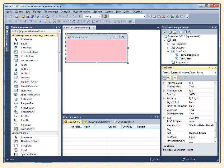 2. Первая оконная программа на С#. Традиционно, в первой программе идёт приветствие всему миру «Hello, world!» ( «Всем привет!» ). Настроим свойства формы: Size свойств, можно и мышкой) Text – Первая форма (только в окне свойств) Back. Color – Pink (розовый). В результате среда VS 2010 примет вид:
