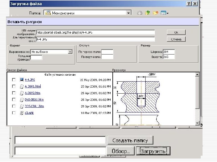 Поля окна вставки рисунка o o URL- адрес изображения – путь к изображению на сервере Альтернативный текст – текст, который появляется вместо рисунка Список файлов – файлы в домашней папке курса «Создать папку» , «Обзор» , «Загрузить» – кнопки для организации «закачки» файла в домашнюю папку