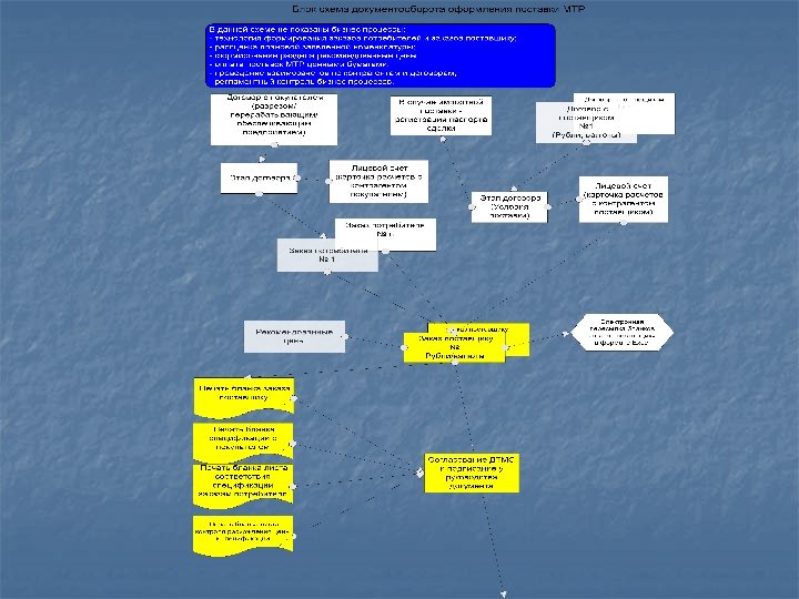 Результаты проекта на данный момент времени § В настоящее время автоматизирован процесс планирования, контрактации, и поставок МТС для предприятий холдинга. § Разработан и внедрен механизм по оценке и выбору поставщиков. § Работники компании полностью освобождены от рутинной ручной работы по формированию различных первичных и отчетных форм. § § Руководство компании обеспечивается оперативной информацией о состоянии бизнес-процесса по снабжению и как следствие имеет возможность контролировать и управлять процессом снабжения на всем цикле этого процесса. Реализована ниже приведенная схема информационных связей для обеспечения хозяйственной деятельности компании