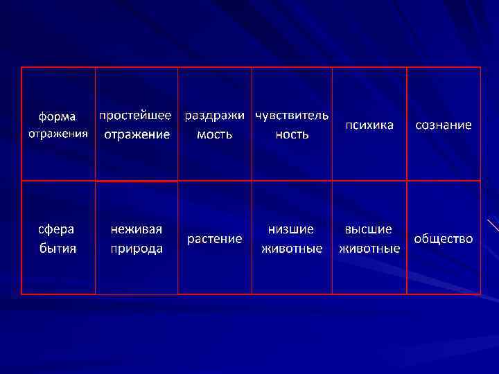 Формы отражения в неживой и живой природе В неживой природе отражение представляет собой свойство вещей воспроизводить под воздействием других вещей такие следы, отпечатки или реакции, структура которых соответствует каким-либо сторонам воздействующих на них вещей (след на песке, зеркальное отражение и т. д. ) Эта форма отражения отличается относительной простотой и пассивным характером. Формы отражения в живой природе: Раздражимость – способность организма к простейшим специфическим реакциям в ответ на действие определенных внешних факторов. Чувствительность – способность организма иметь ощущения, отражающие отдельные свойства предметов, воздействующих на него. Психика – способность создавать чувственные образы внешней действительности в форме восприятий и представлений.