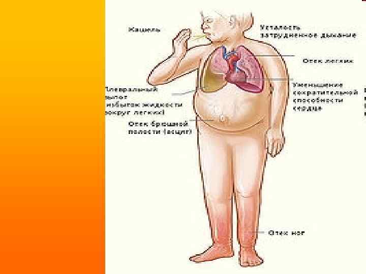 Отеки на ногах • Одна из наиболее характерных жалоб больных с ХСН. Отеки и другие проявления отечного синдрома связаны, в первую очередь, с задержкой Nа+ и воды в организме, а также с застоем крови в венозном русле большого круга кровообращения (правожелудочковая недостаточность) и повышением гидростатического давления в капиллярном русле.