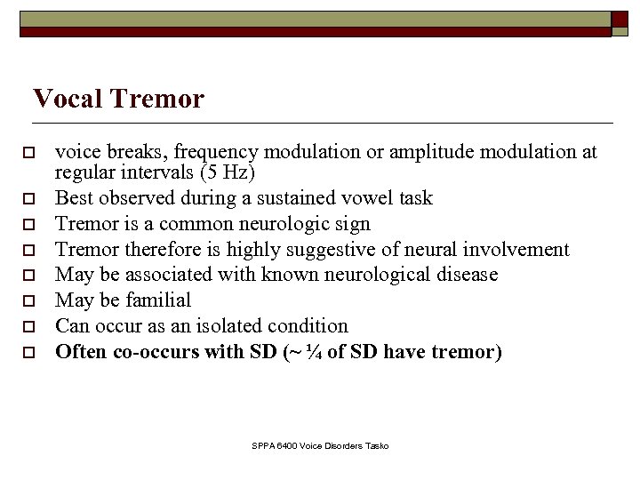 Vocal Tremor o o o o voice breaks, frequency modulation or amplitude modulation at regular intervals (5 Hz) Best observed during a sustained vowel task Tremor is a common neurologic sign Tremor therefore is highly suggestive of neural involvement May be associated with known neurological disease May be familial Can occur as an isolated condition Often co-occurs with SD (~ ¼ of SD have tremor) SPPA 6400 Voice Disorders Tasko