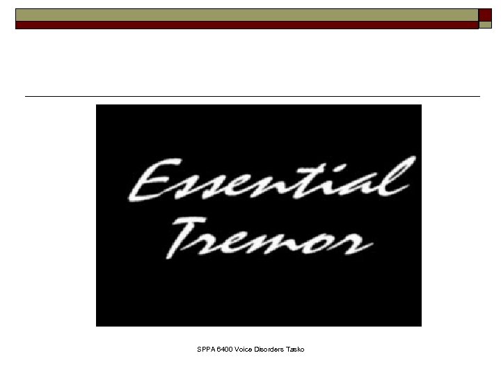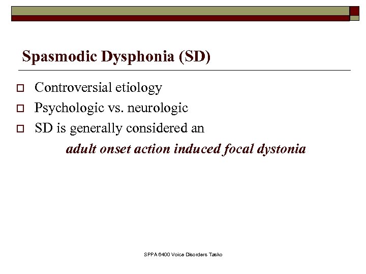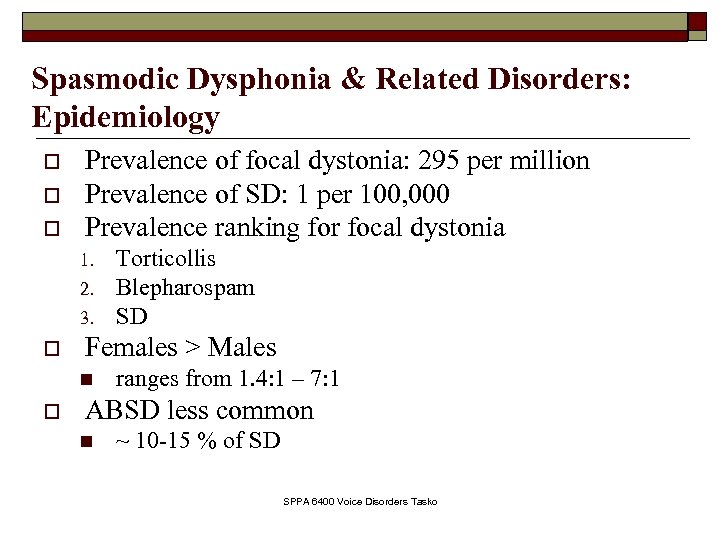Spasmodic Dysphonia & Related Disorders: Epidemiology o o o Prevalence of focal dystonia: 295 per million Prevalence of SD: 1 per 100, 000 Prevalence ranking for focal dystonia 1. 2. 3. o Females > Males n o Torticollis Blepharospam SD ranges from 1. 4: 1 – 7: 1 ABSD less common n ~ 10 -15 % of SD SPPA 6400 Voice Disorders Tasko