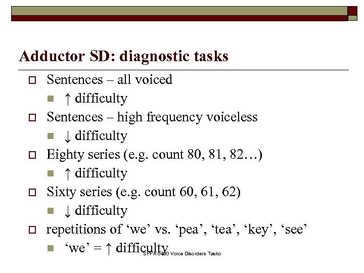 Adductor SD: diagnostic tasks o o o Sentences – all voiced n ↑ difficulty Sentences – high frequency voiceless n ↓ difficulty Eighty series (e. g. count 80, 81, 82…) n ↑ difficulty Sixty series (e. g. count 60, 61, 62) n ↓ difficulty repetitions of ‘we’ vs. ‘pea’, ‘tea’, ‘key’, ‘see’ n ‘we’ = ↑ difficulty SPPA 6400 Voice Disorders Tasko