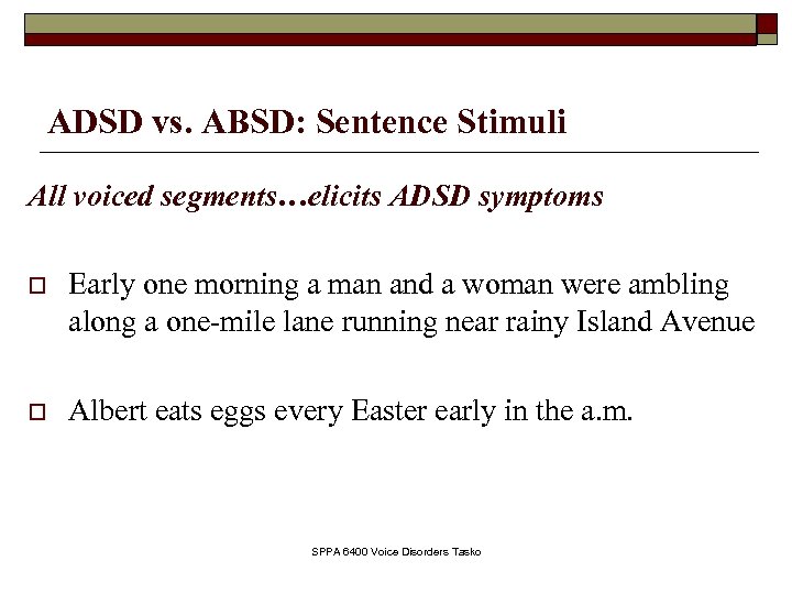 ADSD vs. ABSD: Sentence Stimuli All voiced segments…elicits ADSD symptoms o Early one morning a man and a woman were ambling along a one-mile lane running near rainy Island Avenue o Albert eats eggs every Easter early in the a. m. SPPA 6400 Voice Disorders Tasko